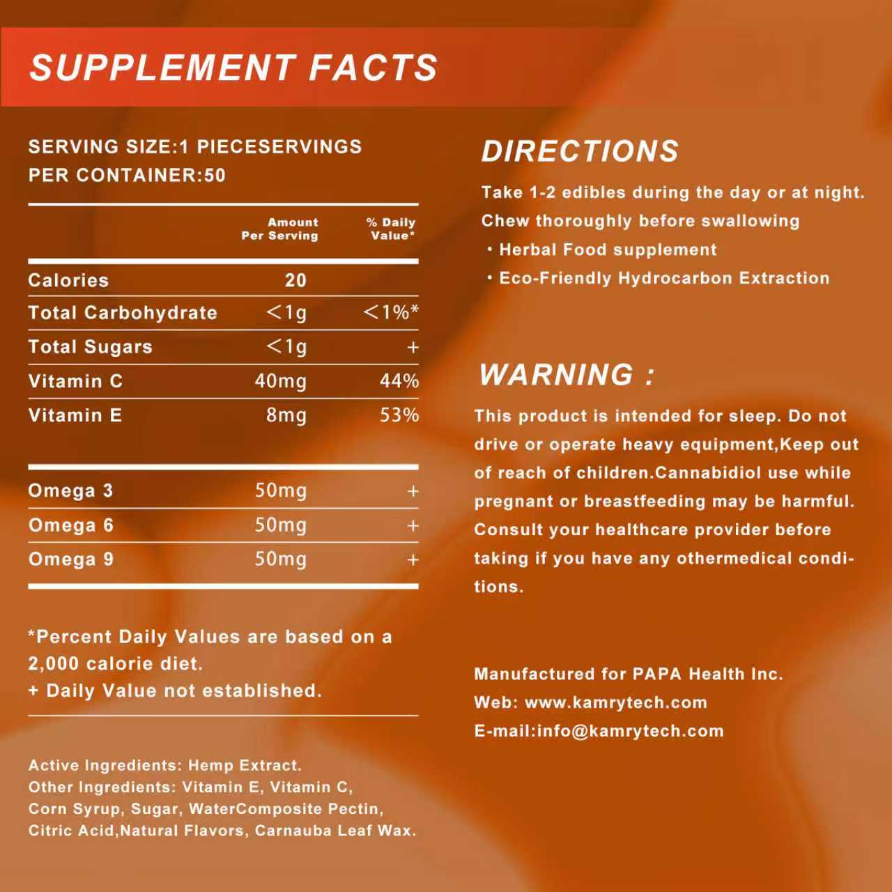 Grown and Made in USA - Kamryh brand comes from America and is focused on providing safe, effective and nutritious hemp edibles. Our hemp gummies have been lab-tested at reputable, accredited, and independent third-party labs to ensure quality and purity. Enjoy a tasty supplement to support your wellness routine.
